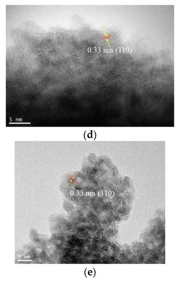 Sizes of SnO2 particles in the nanoaggregates observed in the TEM images of Figure 4a–e. The maximum length perpendicular to the lattice fringes of SnO2 nanoparticles was measured. The average nanoparticle sizes for the TEM images (a)–(e) were 2.6 nm, 2.7 nm, 4.4 nm, 3.5 nm, and 4.3 nm, respectively.
