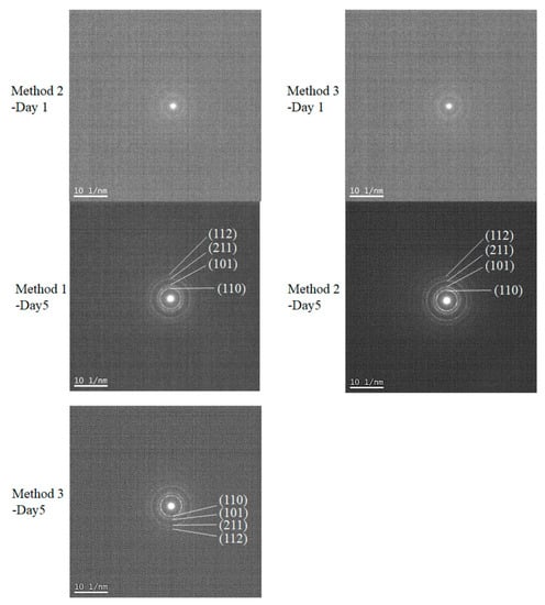 Selected area diffraction (SAD) pattern of Method 1–Day 5, Method 2–Day 1, Method 2–Day 5, Method 3–Day 1, and Method 3–Day 5 samples. These were measured using the same samples as those in Figure 4, which shows the TEM images.