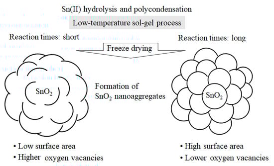 In addition, it was observed that the size of the SnO2 nanocrystals decreased slightly as the SnCl2 amount increased (Table 2). In our low-temperature process, the amount of SnCl2 was another key factor in controlling the size of the primary SnO2 nanoparticles, along with their crystallinity and generation rate of oxygen vacancies. As for the growth mechanism of the SnO2 particles, it is most probable that Sn(II) hydroxide precursors are formed by the hydrolysis of SnCl2 and subsequently converted into submicrometer-scale nanoaggregates comprising uniform SnO2 spherical nanocrystals. Figure 6 shows a conceptual drawing of the crystal growth characteristics of the SnO2 nanoaggregates in our low-temperature sol–gel reaction of Sn(II) and the subsequent freeze-drying process. The longer the sol–gel reaction time, the more enhanced the crystallization through its neighboring particles in a confined part of the nanoaggregates, while the specific surface areas of the SnO2 samples increase. In other words, long reactions produce SnO2 nanoaggregates with single-nanometer-scale lumpy surfaces, providing increased specific surface areas.