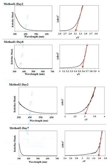 Photoabsorption spectra of Method 1–Day 2, Method 1–Day 8, Method 2–Day 2, Method 2–Day 7, Method 3–Day 2, Method 3–Day 7 samples and their corresponding bandgap estimations.