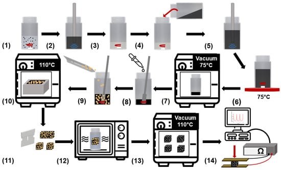 Schematic of the complete fabrication method used to manufacture the porous nanocomposite sensors. The steps include: (1) CNTs mixed in THF, (2) suspension sonicated, (3) PDMS and THF mixed, (4) CNT suspension poured into PDMS and THF solution, (5) mixture sonicated, (6) mixture stirred and THF evaporated on a hot plate, (7) resin degassed in a vacuum oven, (8) PDMS curing agent added to nanocomposite resin, (9) prepolymer mixed with sugar, (10) nanocomposite cured in an oven, (11) cube samples cutout of cured nanocomposite, (12) microwave-assisted porogen removal, (13) samples dried in a vacuum oven, and (14) sponges tested as piezoresistive sensors.