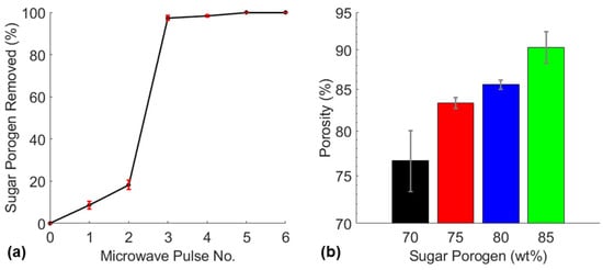 The ability to control the porosity of a piezoresistive sponge is an important capability for the fabrication that most methods lack. Porosity has a major impact on the mechanical and piezoresistive properties of these porous sensors. Porous sensor manufacturing methods should have the ability to control the porosity of the sensors as the compressibility of these sensors may greatly influence the appropriate applications, pressure sensitivity, and their durability. The fabrication method developed in this study allows the manufacturer to significantly vary the porosity and compressive modulus of the sensors by varying the sugar porogen amount between 70 wt%–85 wt%. The varying porosity measurements of the fabricated sensors and the percentage of sugar porogen removed for each microwave pulse are shown in Figure 2.