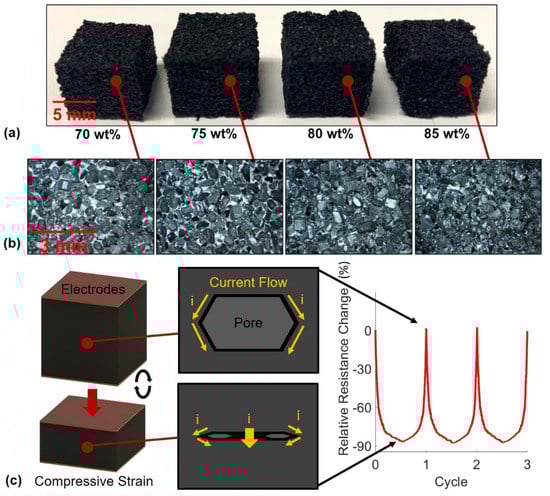 Numerous foams and sponges have been fabricated using different materials to develop highly compressible piezoresistive sensors. Often, the multi-functionality of the flexible sponges is introduced through the dispersion of nanoparticles within the elastomeric matrix or attaching the nanoparticles to the pore walls. Some of the most common piezoresistive sponge fabrication techniques include dip-coating a neat polymer sponge in a suspension of dispersed conductive nanoparticles [19,20,21], sugar templating method where a sugar cube is infiltrated with resin and used as a sacrificial porogen [20,22,23,24], and mixing salt or sugar porogen with the nanocomposite prepolymer before curing [25,26]. Sponges made of polydimethylsiloxane (PDMS) have received significant attention for their biocompatibility and wide functionality including triboelectric generators [27], oil/water separation [28], and piezoresistive sensors [29].