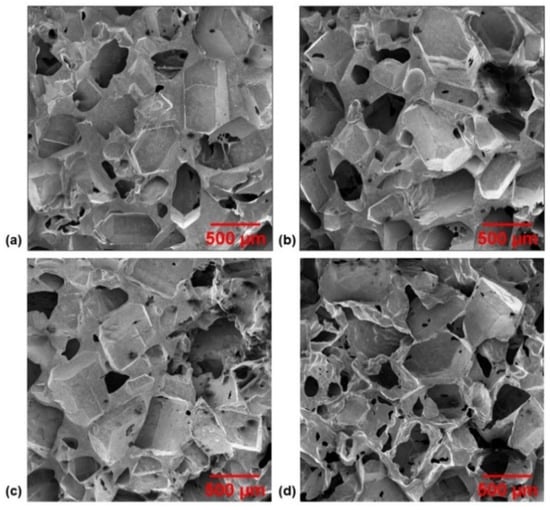 SEM images of the microstructure of various porosity sponges with 3 wt% CNT loadings and (a) 70 wt%, (b) 75 wt%, (c) 80 wt%, and (d) 85 wt% sugar porogen.
