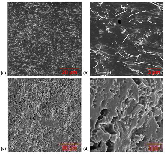 SEM images of the nanostructure of a nanocomposite sponge including (a,b) a cut surface of sponge exposing well-dispersed embedded CNTs and (c,d) an uncut surface of a sponge demonstrating successful embedding of the nanofiller within the polymer matrix.