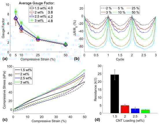 Although similar piezoresistive sensitivity was observed in each sensor, the sponges containing 3 wt% CNT loading demonstrated the highest average sensitivity with a gauge factor of 4.8 (Figure 6a). Additionally, the CNT3P70 sensors displayed the best minimum compressive strain detection of 2% (Figure 3b). The mechanical properties were not significantly affected by the varied loading of CNTs with a relatively consistent compressive modulus of 160 ± 29 kPa between all the sensors. No significant trend was found for the compressive modulus or porosity of each sensor, likely due to significant variations in viscosity between the nanocomposite resins [17], variations in sugar particle sizes, and potential inhomogeneity during the mixing, resulting in spatial porosity variations in the samples (Figure S1). Representative stress–strain curves for the sponges with varied CNT loadings and consistent sugar porogen loading of 70 wt% are shown in Figure 6c. The electrical properties were significantly impacted by the nanofiller loading as the measured resistance was an order of magnitude different between CNT loadings of 1.5 wt% and 3 wt%. The highest CNT loading (3 wt%) displayed the highest number of conductive networks, and therefore the lowest resistance, which proved to be beneficial for establishing reliable contacts with the copper electrodes. Due to demonstrating the highest piezoresistive sensitivity and the highest electrical conductivity, 3 wt% CNT loading was chosen to fabricate sensors with various sugar porogen amounts.
