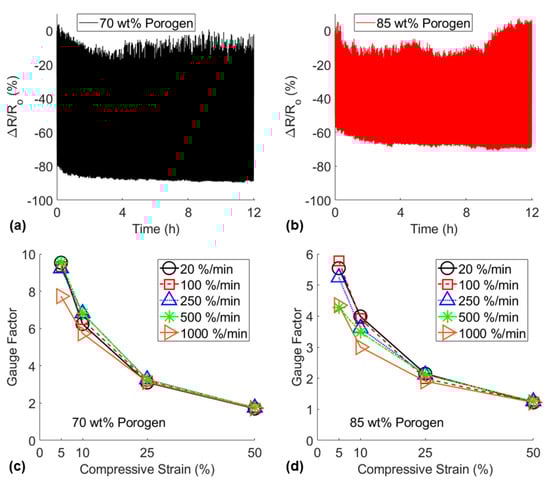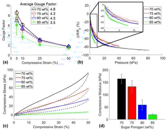 Sugar porogen content was varied to demonstrate the wide range of mechanical behavior of the sponges. Additionally, the piezoresistive sensitivities of the sponges with various porosities were compared to determine the best performing sensor with the highest gauge factor. The results of this study are shown in Figure 7.
