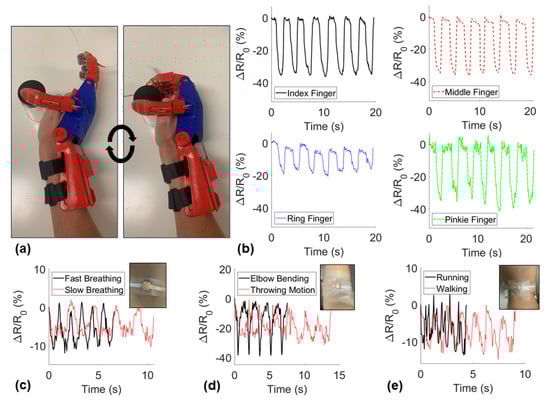 Demonstration of applications of sponge sensors including (a,b) fingertip pressure detection on a prosthetic hand cyclically grabbing an object, and skin-attachable human motion detection on the (c) chest for breath monitoring, (d) inside of the elbow, and (e) back of the knee during running and walking.