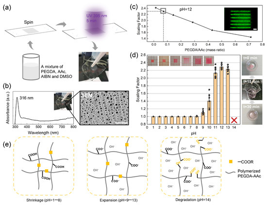 The degradable pH-responsive composite hydrogel provided a uniform environment for the stable photo-induced generation of a silver structure by the reactants inside the gel, which was an attractive and adjustable platform for preparing the silver structure. Furthermore, the hydrogel is rich in carboxylic acid groups which originate from AAc and the ester groups which originate from PEGDA [40]. The expanding behavior of the hydrogel is due to the deprotonation reaction in an alkaline environment [41] and the degradation of hydrogel mainly due to the hydrolysis of ester groups. During the deprotonation process initiated by hydroxide ions, the density of carboxylate ions (COO−) in the hydrogel network increases, and the hydrogel expands due to the volume phase transition caused by electrostatic repulsion forces. Firstly, a degradable pH-responsive hydrogel was prepared; a schematic diagram of the preparation of hydrogel is shown in Figure 1a. Meanwhile, the UV–Vis absorption spectrum of the hydrogel is shown with the maximum absorption peak at 316 nm in the left of Figure 1b; the inset shows a colorless and transparent hydrogel. The right of Figure 1b displays the SEM image of the degradable pH-responsive hydrogel. In order to achieve a larger scaling factor defined by Equation (1), the mass ratios of PEGDA to AAc have been adjusted, as shown in Figure 1c. As the mass ratio decreases, the scaling factor of the degradable hydrogel increases accordingly. When the PEGDA/AAc mass ratio was 0.014, the hydrogel was soft and not suitable for effectively supporting silver structures; therefore, we chose 0.071 as the PEGDA/AAc mass ratio, where PEGDA was 0.05 g, and AAc was 0.7 g. The inset shows a dark-field microscopic image of the silver line structures processed in the hydrogel with a 0.071 mass ratio of PEGDA/AAc.