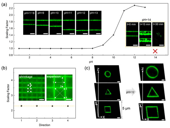 Figure 2a reflects the scaling factors of silver line spacings along with the changes of pH, which is consistent with the scaling factor curve of the degradable pH-responsive hydrogel shown in Figure 1d. A good matching result revealed the synchronous changes of the gel and information, indicating that the silver particles reduced by the 532 nm fs laser were tightly adhering onto the gel. The scattering signals of silver line structures at pH values of 1.5–13 were read in the dark-field images shown in the illustrations. At pH 14, silver line structures gradually disappeared, accompanied by the degradation of hydrogel. Insets in the yellow dotted box are the dark-field images of the degradation process of silver line structures. When the immersing time accumulated to 15 min, silver line structures were distorted with the line width becoming coarse, which indicated that the pore structures of the gel had been degraded. After 30 min, silver line structures disappeared, and only a few free silver nanoparticles could be observed with the dark-field microscope. Meanwhile, homogeneity of the scaling process of hydrogel was also verified. As shown in Figure 2b, variations of the line spacings of the silver grid structures in four directions (white arrow) at the shrinkage state and the fully expansion state (pH of 12) were observed and measured by the dark-field imaging. Substituting the measured line spacings into Equation (1), the scaling factors in four directions were calculated and the negligible standard deviation was obtained, which showed that the degradable pH-responsive hydrogel possessed a superior expanding uniformity. Furthermore, we achieved the 3D information input in the degradable pH-responsive hydrogel as shown in Figure 2c. The left pictures are the dark-field images of three-layer data information, consisting of circular, triangular and square silver structures with a vertical layer spacing of 5 μm in hydrogel with a shrinkage state. The right pictures are the dark-field images of the three-layer silver line structures within the hydrogel platform of the equilibrium state (pH 12). Compared with the original silver pattern, the sizes of the 3D silver pattern treated with solution of pH 12 increased and the layer spacings changed accordingly.