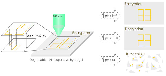 Schematic illustration of degradable pH-responsive hydrogel for security-enhanced 3D data encryption. Information recording is shown in the left figure; the double-layer structure written by the 532 nm femtosecond laser has a layer spacing for ∆z (∆z ≤ D.O.F., D.O.F. represents the depth of focus of the decryption system). The right figure is the schematic diagram of information reading. Different pH values are applied to the recording medium with encrypted information for data decryption, and three information states can be obtained, namely, encryption, decryption and irreversible.