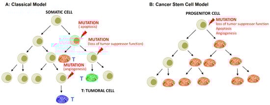 - The stochastic or classical model states that any somatic cell has the intrinsic ability to undergo mutation and transform into CSCs driven by genetic instability or environmental signals, as shown in Figure 1A;