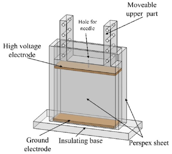 The structure of the experimental cell, which is similar to that used before [42], is shown in Figure 1. To facilitate the observation of the experimental process, the cell was made of transparent Perspex. Brass plates with the dimensions of 90 mm × 25 mm were polished, as were the electrodes, which were arranged parallel. A high voltage electrode was attached to the bottom of the slider, which could change the distance (in this study, the distance is 64 mm) between the two electrodes. Furthermore, a ground electrode was fixed at the insulating base. A small hole with a diameter of 1 mm through the mid-point of the movable slider enabled a hypodermic needle to pass through. The needle was attached to a syringe (Hamilton micro-liter syringe) and used to introduce small aqueous droplets into the cell, the radii of which ranged from 914 to 1240 µm. The released position of the droplets was the same. When the bottom of the droplet reached a specific position, the power was turned on to apply the electric field. The electric field aided in the acceleration of the migration and coalescence of the droplet.