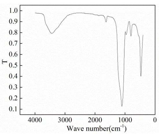 To prepare nano-fluids, SiO2 NPs and deionized water were used. The size of the SiO2 NPs was measured using scanning electron microscopy (SEM, Hitachi SU8010, Tokyo, Japan), and the size was found to be about 30 nm (±10 nm). X-ray diffraction (XRD, Tensor II, Bruker Optics, Ettlingen, Germany) was employed to detect the chemical groups on the surface of the NPs. The results are shown in Figure 2 and Figure 3, respectively. Through comparison with the Standard Infrared Spectrum Atlas, the characterization results confirmed that the wide absorption peak at 3439.88 cm−1 corresponded to the antisymmetric and symmetrical stretching vibrations of the –OH group. The strong absorption band at 1100 cm−1 is attributed to Si–O–Si antisymmetric stretching vibration. The peak at 958 cm−1 belongs to the bending vibration absorption peak of Si–OH, and the peaks at 800 and 469 cm−1 correspond to the symmetrical stretching and bending vibrations of Si–O bond. The deionized water was produced using Millipore ultrapure water systems. In experiments, the mass concentration of SiO2 NPs was 0.5%, 1%, and 2%, respectively.