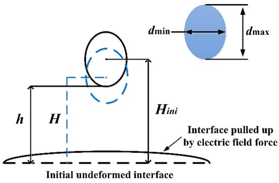 Between them, dmax and dmin represent the length of the long axis and the short axis of the droplet, respectively. H/Hini is defined as the dimensionless height of the droplet center, where H and Hini are the real-time distance and the initial distance between the droplet center and the undeformed oil–water interface, respectively, and quantitatively reflect the vertical displacement of the falling droplet. Moreover, h represents the distance between the bottom of the falling droplet and the initial undeformed oil–water interface at the moment the electric field was applied.
