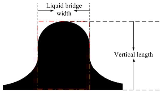 For droplet–interface coalescence, owing to the asymmetry between the upper and lower agglomerates and the dynamic change in the morphological characteristics of the coalescence droplet, the development of the droplet morphology was difficult to describe. Figure 5 shows the typical morphology of coalesced droplets, where the red dotted line in the figure indicates the liquid bridge area. In this study, the characteristic parameters that define the shape of the droplet include the liquid bridge width, which corresponds to the length of the rectangular structure shown in red dotted line, which is used to describe the expansion and contraction of the liquid bridge in the horizontal direction. The droplet apex height represents the distance from the highest point of droplet to the undeformed oil–water surface, which is used to reflect the change in droplet height in the vertical direction. For more convenient comparative analysis, the instantaneous liquid bridge width and the droplet apex height were kept dimensionless using the diameter and the initial droplet apex height, respectively, which are defined as the dimensionless liquid bridge width (Wliquid bridge width/D) and the dimensionless droplet apex height (Hvertical length/Hinitial vertical length), respectively.