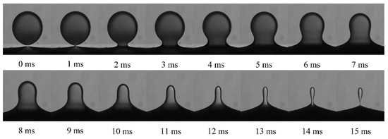 The typical droplet–interface coalescence process observed in experiments is shown in Figure 6. In this study, the electric field strength was 256 kV m−1, and the droplet diameter was 1241 µm. In order to exclude the effect of height, the initial height between the droplet and the interface was fixed at 0.5 mm. As mentioned above, the NP concentration ranged from 0 to 2 wt% to study the effect of the NPs. For example, as shown in Supplementary Materials Video S1, where the NP concentration is 0.5 wt%. It showed the dynamic process of drop–interface partial coalescence, which was more visualized.