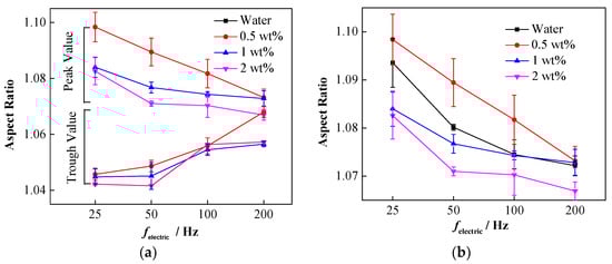 It was found that the deformation degree of the nanoparticle-laden droplets decreased with the increase in the frequency. The deformation peaks and trough values in the last oscillation period before the droplet made contact with the interface were considered for further analysis. Figure 10a shows that with the increase in the frequency of the electric field, the decreased peak values and increased trough values continue to approach, which indicates a decrease in the oscillation amplitude. Moreover, the concentration of the NPs also affects the deformation amplitude of the droplets. Figure 10b shows the deformation peaks of nanoparticle-laden droplets at different concentrations. Clearly, under different electric field frequencies, the 0.5 wt% droplets exhibited the largest deformation peak, followed by the 1 wt% droplets, and that of the 2 wt% droplets was the smallest. This indicates that increasing the concentration of NPs suppresses the oscillating deformation of droplets in an AC electric field. Compared to pure droplets, the 0.5 wt% droplets have a larger oscillation deformation peak in the last period before making contact with the interface, which is related to the reduction of the interfacial tension of the droplets caused by the NPs. However, the oscillation deformation peaks of the 1 and 2 wt% droplets become smaller, which is caused by the rigid particle interface film on the droplet surface.