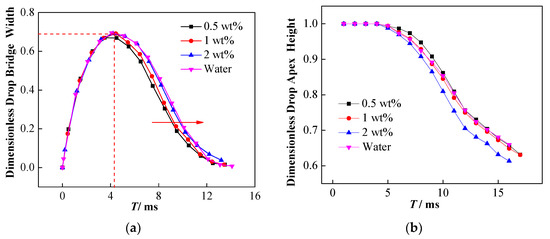 Effect of NPs on droplet bridge topological changes. (a) Effect of NP concentration on the development of dimensionless liquid bridge width; (b) effect of NP concentration on dimensionless droplet apex height.