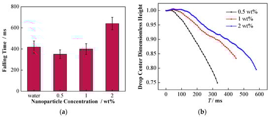 Effect of NP concentration on the migration of falling droplet. (a) The time of the droplet center falling to the interface under different particle concentrations; (b) effect of NP concentration on the dimensionless droplet center height.