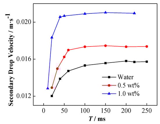 The influence of NP concentration on the velocity of the secondary droplets is shown in Figure 16. The higher the particle concentration is, the faster the acceleration of the secondary droplets is, and the greater the stable rising speed is.