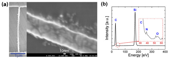 Figure 1a shows a scanning electron microscopy (SEM) image of a single free-standing nanostripe. In addition, the energy-dispersive X-ray spectroscopy (EDS) analysis was also used to confirm the elemental composition of the nitrogen-doped UNCD nanostripe, as shown in Figure 1b. The data generated by EDX analysis consist of peaks corresponding to the elements making up the true composition of the sample being analyzed, including C, N, O, and Si. The X-ray intensity variations indicate a great concentration of carbon while the silicon peak is from the SiO2 sacrificial layer below the UNCD nanostripes.