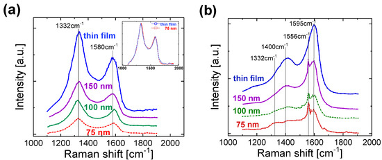Raman spectroscopy is the most widely used non-destructive chemical analysis technique which provides detailed information about the N-UNCD material quality. To characterize UNCD nanostripe at a global level, confocal Raman microscopy was employed at both 633 and 325 nm wavelengths. As shown in Figure 2, it is clear that as the nanostripe width scales down, the intensity of Raman spectra decreases in both visible and UV Raman spectra since the nanostripe width is much smaller than the excitation laser spot size (dia. ≥ 1 μm). After normalization, as shown by the inset in Figure 2a, for example, the Raman intensity curve of 75 nm wide nanostripe matches closely to that of the thin film. Each individual Raman spectrum shows typical shapes with two broad bands centered at 1332 cm−1 and 1580 cm−1, which demonstrate intrinsic N-UNCD signatures which are assigned to the D and G peak of sp2-bonded carbon, respectively [13]. The spectra profiles remain consistent, neither peak shift nor peak intensity ratio change was observed.