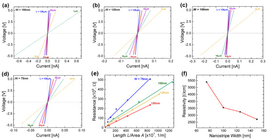 The typical VI characteristics of (a) 150 nm, (b) 125 nm, (c) 100 nm and (d) 75 nm wide NUNCD nanostripes of various lengths measured at room temperature. (e) The measured resistance as a function of the ratio of the nanostripe length/cross-section for nanostripes of different widths. The solid line is the linear fitting. (f) The electrical resistivity as a function of the nanostripe width after the contact resistance has been deducted.