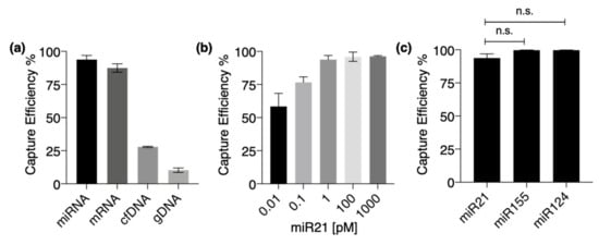 Capture of miRNAs on annealed ZnO/Al2O3 core-shell nanowires. (a) Comparison of capture efficiency of the nucleic acids, miRNAs, mRNAs, cfDNAs, and gDNAs. (b) Capture efficiency of miR21 on nanowire at presences of 0.01, 1, 10, and 1000 pM. (c) Comparison of capture efficiency of miR21, miR155, and miR124. Error bars show standard deviation for a series of measurements (n = 3). n.s. indicates not significant.