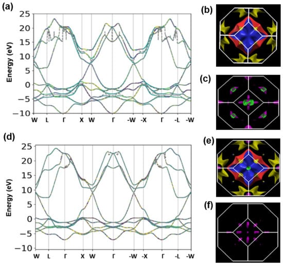 Figure 1 shows the electronic structures and the signatures of spin transport for Pt (top panels) and Pd (bottom panels). Figure 1a,d show the band structures with and without the inclusion of SOC for Pt and Pd. In addition to the energy eigenvalues, the spin character is also displayed in color in the band structure plots. Red denotes spin upward (↑↑) states and blue denotes spin downward (↓↓) states. The band structure without SOC is shown as dashed grey lines for paired spin (↑↓) states. Although SOC can increase Kramers degeneracies between electron states that are protected by time reversal symmetry when it is absent, the SOC had no effect at the Γ-point for Pt and Pd. The band structures Figure 1a,d in show band points as superpositions of red, blue, and grey lines under an imposed time reversal symmetry constraint where E(k) = E(−k). In Pt (see Figure 1a), there is a band crossing at a W-point approximately 8.0 eV above the Fermi level; however, the degeneracy is lifted by the SOC and the bands become split by 1 eV at this point.