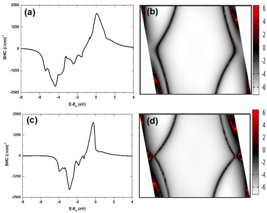 Figure 2 shows the signatures of spin transmission in Pt and Pd in terms of the spin Hall conductivity and the spin texture as a projection of the reciprocal space contour map. Figure 2a,c show the calculated spin Hall conductivity (SHC) for Pt and Pd at 0 K. At the Fermi level, our calculations show values of 1977 Ω−1cm−1 for Pt and 449 Ω−1cm−1 for Pd. Our results are consistent with the prior values of 2000 Ω−1cm−1 [] and 2170 Ω−1cm−1 [] for Pt and 330 Ω−1cm−1 [] for Pd. By contrast, the room temperature measurement of 2.4 × 104 Ω−1cm−1 for Pt is far higher than the calculated value of SHC at 0 K []. We note that the peak positions in the SHC plots shown in Figure 2a,c are shifted above (or below) the Fermi level in Pt (or Pd). Considering the minimalistic differences between the Pt and Pd band structures (see Figure 1a,d), our observations of a small SHC signal at the Fermi level are attributable to the differences in their spin textures.