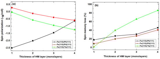 Heavy metal layer thickness dependence of the absolute spin polarization (a) and spin memory loss (b) in barrierless heterobilayer interfaces. The points plotted on the axis of increasing spin polarization correspond to increasing thicknesses of HM species in monolayers.