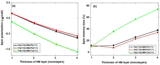 where denotes the unit vector of the magnetization and g^(↑↓) is the spin mixing conductance []; however, the efficiency of spin transport across HM/FM and hBN/HM interfaces is determined by the effective spin mixing conductance (g_eff^(↑↓)) []. In a spin Hall regime, the heterostructure contains only one FM/HM interface. The first term in Equation (9) accounts for band structure mismatching and spin decoherence in HM/hBN and hBN/Fe(110) heterobilayer interfaces and interfacial effects for polarization of the FM layer. The second term, which accounts for the spin accumulation at constituent interfaces, is also sensitive to the transparency of the interface (see Section 3.4).