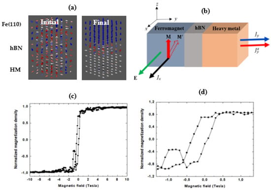 Figure 5 shows the dynamic properties of Fe(110)/hBN/HM magnets in terms of the SHE measurement geometry. Figure 5a shows an Ising-like spin ice model of the magnetic state in the Fe(110)/hBN/HM(Pt) stack obtained from layer-resolved spin orientations at a ground state in the spin Hall regime. It is clear from Figure 5a that no long- or short-range order exists in the local arrangement of atomic spins of the initial configuration. The fact that the net magnetization is non-zero in the Heisenberg spin model of the Fe(110)/hBN/HM(Pt) stack at the ground state, despite the disordered spin geometry, suggests the presence of some residual spin order. The final spin configurations in specific atomic layers of the Fe(110)/hBN/HM stack are ordered due to the different directions of the flow of the charge current and injected spin current. In the SHE measurement geometry shown schematically in Figure 5b, M denotes the magnetization vector corresponding to spin polarization () due to spin quantization along the z-axis of the stack. The directions of the applied charge current density (Jc) and external magnetic field (H) for the calculation of the hysteresis loops are reversible; however, the magnetization M is collinear with field H. The HM species are nonmagnetic. In addition, the wide band gap of the hBN layer endows it with high resistivity. Thus, the apparent intrinsic order in directions of spin is determined by the direction of flow of spin angular momentum as the spin current is injected in the HM layer.