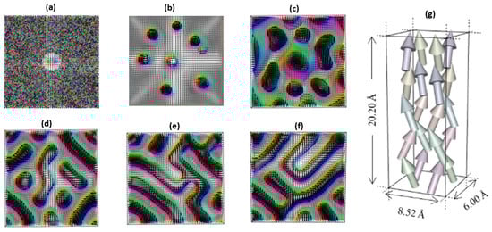Figure 7 shows the field dependence for the skyrmion dynamics. The onset of nucleation of MS at 25 T and at a time evolution after 150 ps is shown in Figure 7a,b, respectively. The time–space spin texture maps reveal that the axes of each of the skyrmions extend asymmetrically into the whole structure; however, the MS axis elongates only in the collinear direction with the applied magnetic field. The thermodynamic limit of the spin textures appears as spherical swirls at 25 T. At this high magnetic field limit, the MS boundaries are sharp, and spin swirls are clearly separated from the ordered spin of the underlying geometry. Such spherical swirls, when coded to the “on state”, in combination with simultaneous coding of the ordered spin background to the “off state”, allows for the bistable control of racetrack memory [,]. By contrast, the effect of a continuous reduction in the magnetic field intensity from 25 to 2.5 T is also shown in Figure 7c–f. This reveals that the spin texture exhibits a systemic collapse at low fields. The stable symmetrically spherical swirls observed at 25 T appear to lose their compact shape by continuously coalescing into neighboring spin sites to form curved rod-like spin structures.