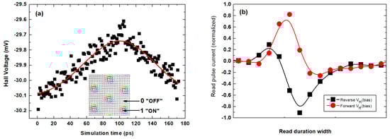 Figure 9 shows the electrical read-out using the skyrmion-induced Hall voltage signal. Figure 9a shows the profile of the MS state fitted from the distribution of the Hall voltages (VH) induced by the MS state in a 170 ps duration of the read-in pulse. Clearly, the distribution shows an asymmetrical Gaussian profile due to the intrinsic behavior of spin carriers under the skyrmion with THE. The maximum value of the instantaneous VH is 29.6 mV after 170 ps. It is crucial to emphasize that the negative VH signal (Figure 9a) is a unique contribution of the skyrmion with THE. Its sign is opposite to that of the normal Hall effect, and its magnitude denotes the skyrmion. In a memory cell of constant resistance, the maximum VH signal yields a constant current pulse. For instance, in the racetrack memory element, this constant current is typically ~30 × 1010 Am−2 for which a duration 0.3 ns is needed to activate the electrical read-in []. Figure 9b shows the spectrum of the read-in pulse current for both the forward and reverse bias of the maximum VH signal. The best fit spectrum of the normalized read pulse current shows an inverted signal profile in reverse bias, and nearly constant full width at half maximum (FWHM) independent of the direction of bias. The invariance of the FWHM and the base-to-peak height of both read pulses relative to the constant offset (I0 = 0) shows the electrical read-in state of the MS within 170 ps.