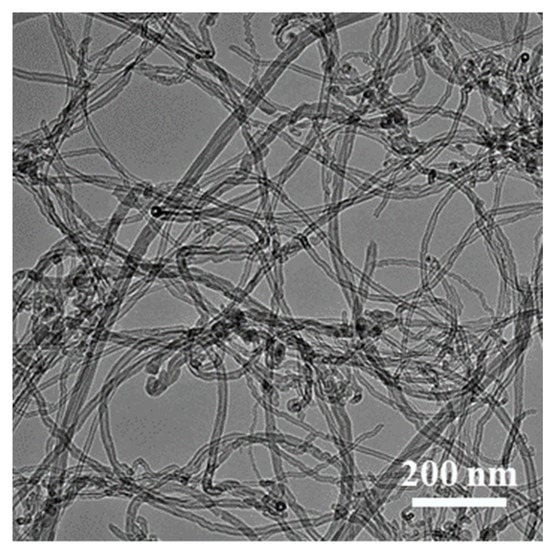The template method was used to prepare open-cell composite foams. The melamine foam (Outlet Technology Co. Ltd., Chengdu, China) with open porosity of about 99.8%, pore diameter of 100–200 μ m and wire diameter of 6–9 μ m was used as a template. The experiment mainly included the following steps: (1) chemical plating of silver deposits on melamine foams to make it conductive. The melamine foam in the experiment was cut into a cylindrical shape with diameter of 30 mm and height of 5 mm. First, ammonia water was added drop wise to the silver nitrate solution (20 g/L), shaking while dripping, until the initially formed precipitate just dissolved. Then, the melamine foam was immersed in the silver mirror reaction solution. The glucose solution (100 g/L) was dropped into the solution and reacted at 25 °C for 8 min and then taken out, rinsed and dried. (2) Composite electrodeposition of Cu/CNTs layers on the silver-plated foam surface. The electrodeposition solution contained CuSO4·5H2O (200 g/L), H2SO4 (60 g/L), polyethylene glycol (0.03 g/L), 2-butyne-1,4-diol (0.2 g/L) and CNTs dispersant (1 g/L). The CNTs dispersant (Chengdu Organic Chemistry Co. Ltd., Chengdu, China) was composed of 10 wt.% of CNTs (inner diameter of 5–20 nm, outer diameter of 30–50 nm and average length of 10 μm, as shown in Figure 1). The copper plate was used as the anode, and the silver-plated foam was used as the cathode. Electrodeposition was conducted for 7 h at a current density of 2 A/dm2. After electrodeposition, the foams were rinsed with deionized water and dried at 60 °C for 4 h. (3) Composite electrodeposition of Ni/CNTs layers on the Cu/CNTs foam. Electrodeposition solution contained: NiSO4·6H2O (80 g/L), NiCl2·6H2O (80 g/L), saccharin (1 g/L), boric acid (40 g/L), sodium dodecyl sulfate (80 mg/L), 2-butyne-1,4-diol (0.4 g/L), CNTs dispersant (1 g/L). The nickel plate was used as the anode, and Cu/CNTs foam was used as the cathode. Electrodeposition is carried out for 1 h at a current density of 3 A/dm2. After electrodeposition, the foams were rinsed with deionized water and dried at 60 °C for 4 h. The same process and steps were used to prepare Cu-Ni foams without CNTs in the solution. (4) The heat treatment process was carried out in a furnace with two stages in a reducing atmosphere (volume ration of H2: N2 = 1:10). At the first stage, the foam was heated at 650 °C for 1 h to pyrolyze the melamine template. At the second stage, the foam was heated at 800 °C for 1 h. The samples and the related parameters are listed in Table 1.