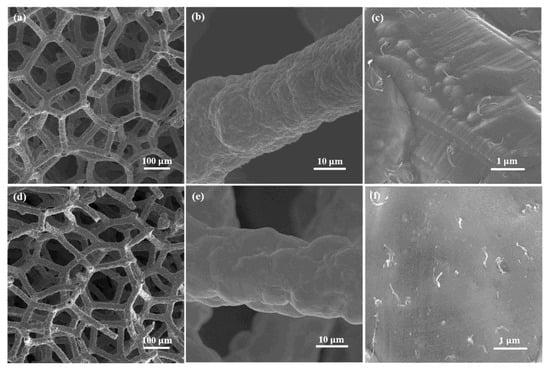 Figure 2. The SEM observation of Cu-Ni/CNTs foams at different magnifications; (ac) before heat treatments; (df) after heat treatments.