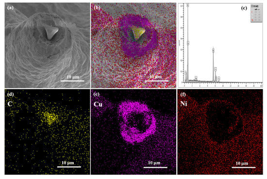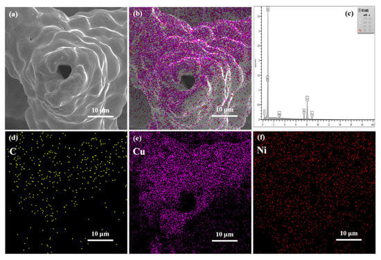 Figure 4 shows the cross-sectional observation of the Cu-Ni/CNT foam skeleton after heat treatment. The melamine template has been removed and a pore has been left in the skeleton center. The EDS analysis results in Figure 4b–f show that Cu and Ni atoms both appeared in the inner and outer layers, indicating that the mutual diffusion had occurred in the Cu and Ni layers. Cu atoms and Ni atoms tend to mutually diffuse and nucleate at the place where the interface energy is the highest [18]. Through the heat treatment, the entire composite layer was strengthened by the formed solid solution alloy, and the interface structure between the Cu and Ni layers was optimized [19].