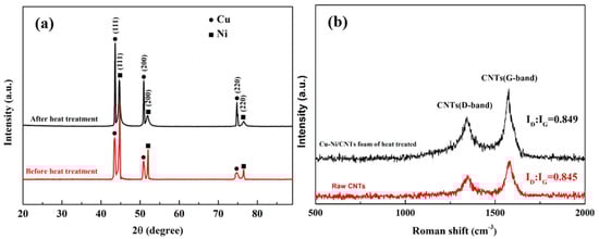 Figure 5. (a) The XRD diffraction of Cu-Ni/CNTs foam before and after heat treatment; (b) Raman spectra of raw CNTs and Cu-Ni/CNTs foam after heat treatment.