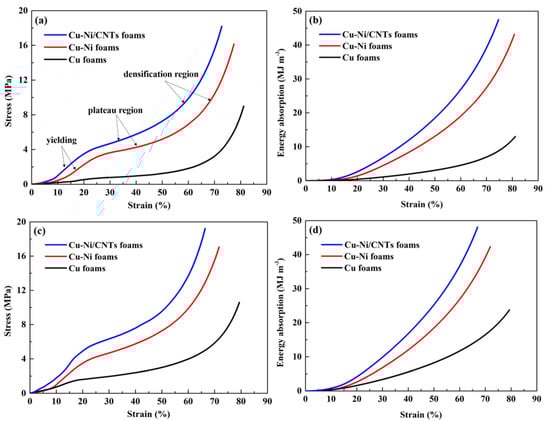 Figure 7. The compressive properties of Cu foams, Cu-Ni foams and Cu-Ni/CNTs foams; (a) stress−strain curves before heat treatment; (b) energy absorption capacity before heat treatment; (c) stress−strain curves after heat treatment; (d) energy absorption capacity after heat treatment.