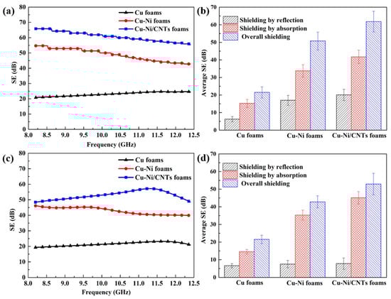 Figure 8. The electromagnetic shielding performance of Cu foams, Cu-Ni foams and Cu-Ni/CNTs foams in the frequency range of 8.2–12.4 GHz; (a) SE before heat treatment; (b) average EMI SE before heat treatment; (c) SE after heat treatment; (d) average EMI SE after heat treatment.