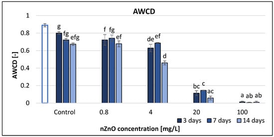 The effect of ZnO nanoparticles on freshwater average well colour development value. Letters on the columns indicate significant differences (level of significance: p < 0.05).