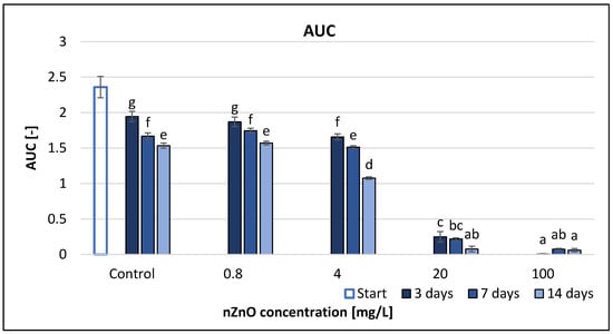 The effect of ZnO nanoparticles on freshwater area under the curve value. Letters on the columns indicate significant differences (level of significance: p < 0.05).