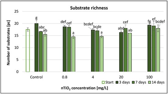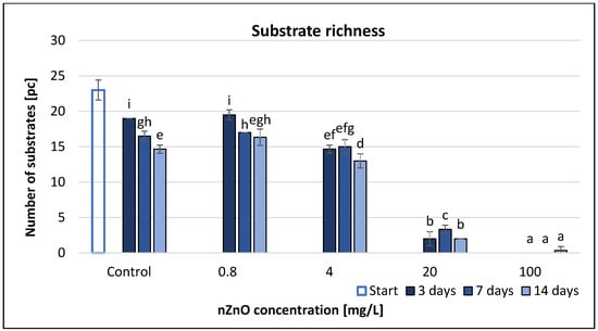 The effect of ZnO nanoparticles on freshwater substrate richness value. Letters on the columns indicate significant differences (level of significance: p < 0.05).