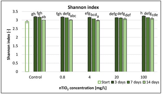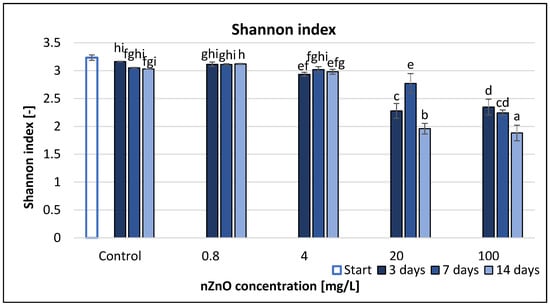 The effect of ZnO nanoparticles on freshwater Shannon index value. Letters on the columns indicate significant differences (level of significance: p < 0.05).