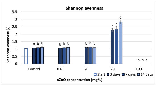 The effect of ZnO nanoparticles on freshwater Shannon evenness value. Letters on the columns indicate significant differences (level of significance: p < 0.05).