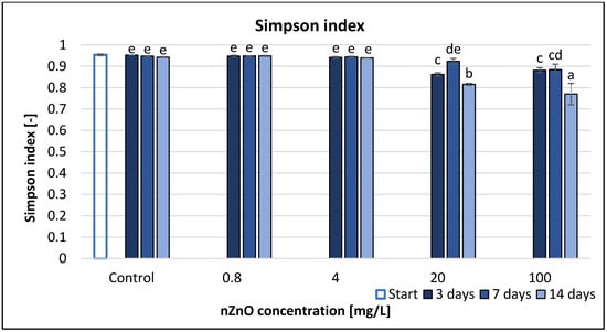 The effect of ZnO nanoparticles on freshwater Simpson index value. Letters on the columns indicate significant differences (level of significance: p < 0.05).