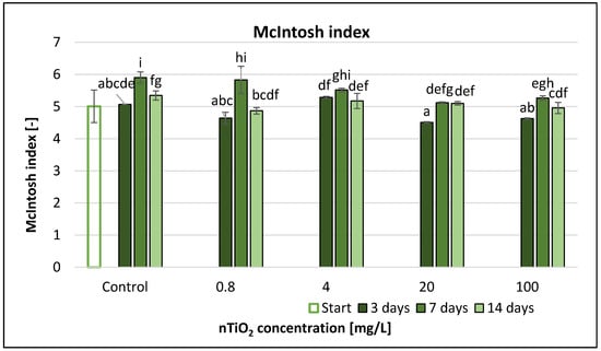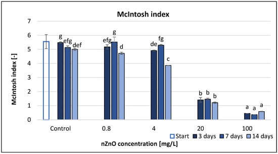 The effect of ZnO nanoparticles on freshwater McIntosh index value. Letters on the columns indicate significant differences (level of significance: p < 0.05).