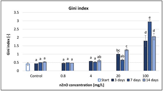 The Gini index (G) increased with the applied nZnO concentration (Figure 8). Low Gini index values indicated high levels of functional diversity []. Gini index illustrated significant effects only at higher nZnO concentrations (20; 100 mg/L). Highest increase (493%) compared to control occurred at 100 mg/L concentration after 7 days. Statistical analysis showed that not just the treatment, but also the treatment-time interaction had a significant effect (Table 2). Correlation analysis (r = 0.824–0.903) revealed strong positive relationship between the concentration and Gini index, which was significant at p < 0.05 (Table S1).